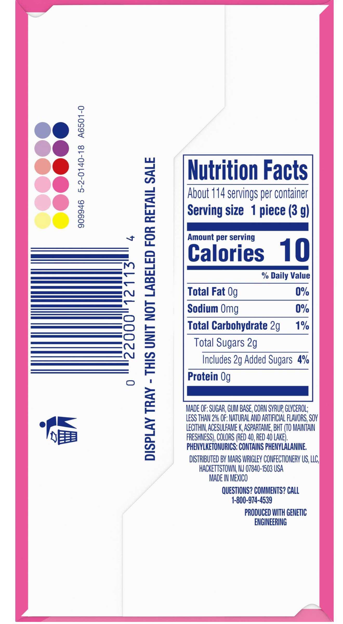 Sugar, Gum Base, Corn Syrup, Glycerine, Lecithin, Artificial Flavors, Acesulfame-k, Aspartame, Red 40 Lake, Red 40 and Bht (to Maintain Freshness).