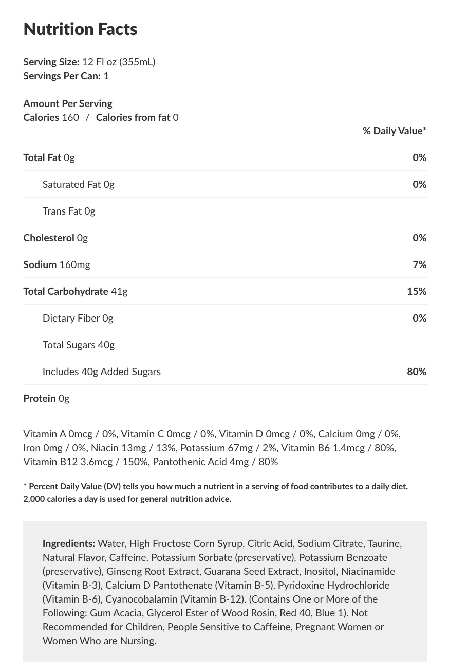 Water, High Fructose Corn Syrup, Citric Acid, Sodium Citrate, Taurine, Natural Flavor, Caffeine, Potassium Sorbate (preservative), Potassium Benzoate (preservative), Ginseng Root Extract, Guarana Seed Extract, Inositol, Niacinamide (Vitamin B-3), Calcium D Pantothenate (Vitamin B-5), Pyridoxine Hydrochloride (Vitamin B-6), Cyanocobalamin (Vitamin B-12). (Contains One or More of the Following: Gum Acacia, Glycerol Ester of Wood Rosin, Red 40, Blue 1).